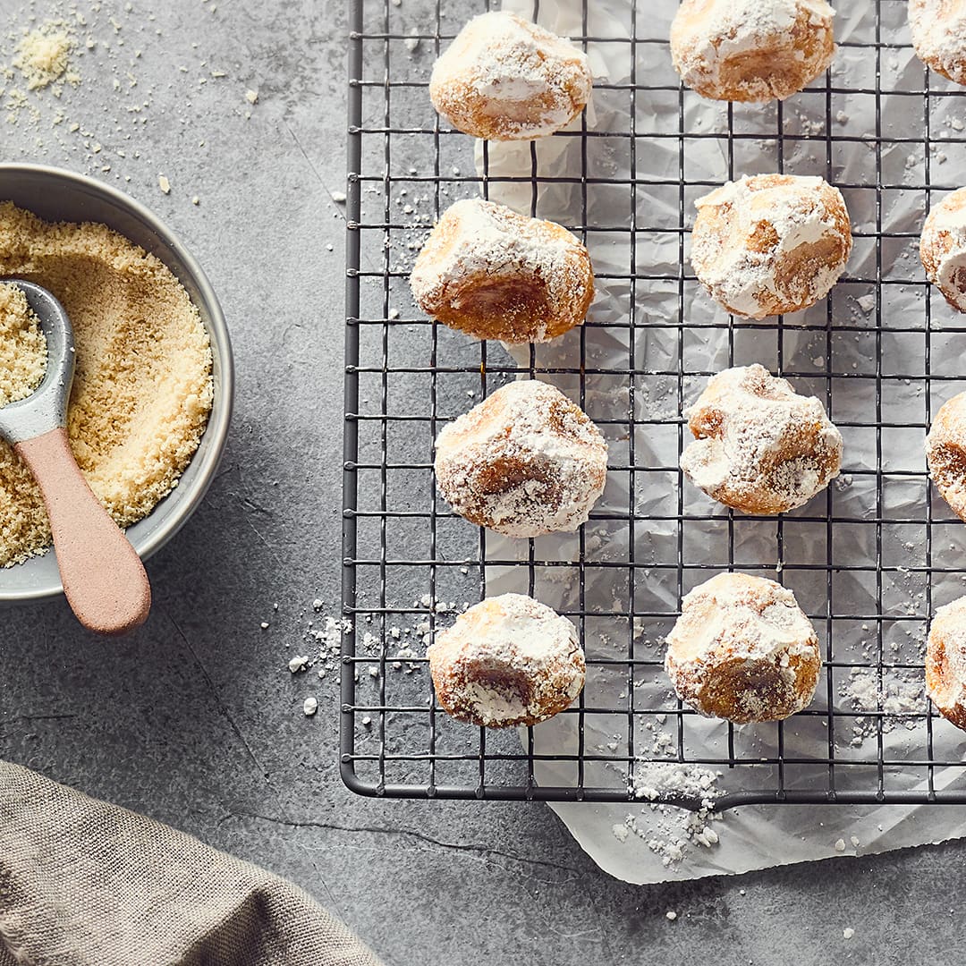 Web 150 g gemahlene Mandeln 75 g brauner Zucker 2 EL Mehl ½ TL Backpulver 80 g Puderzucker Schüssel Backofen auf 180 Grad Umluft vorheizen.